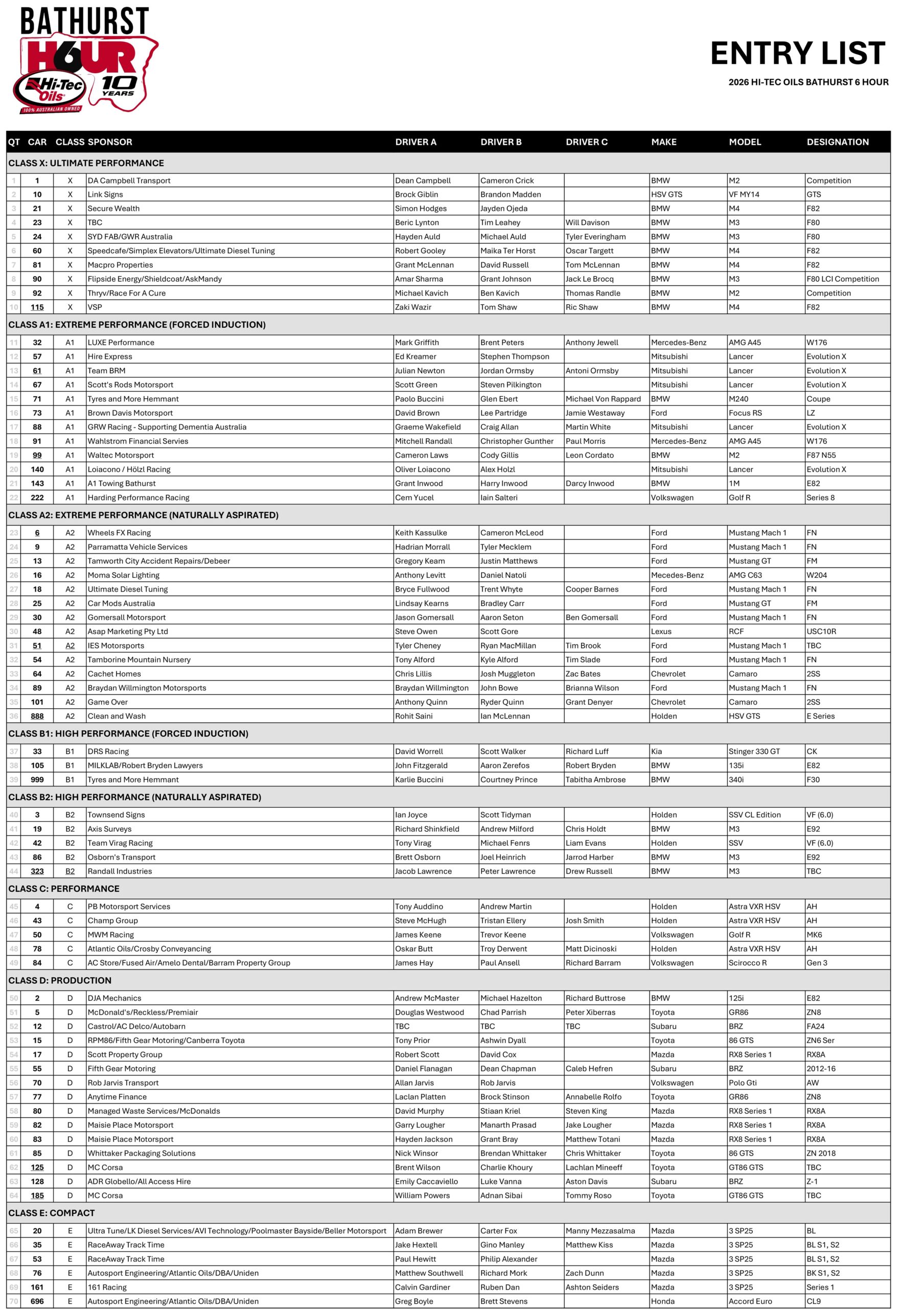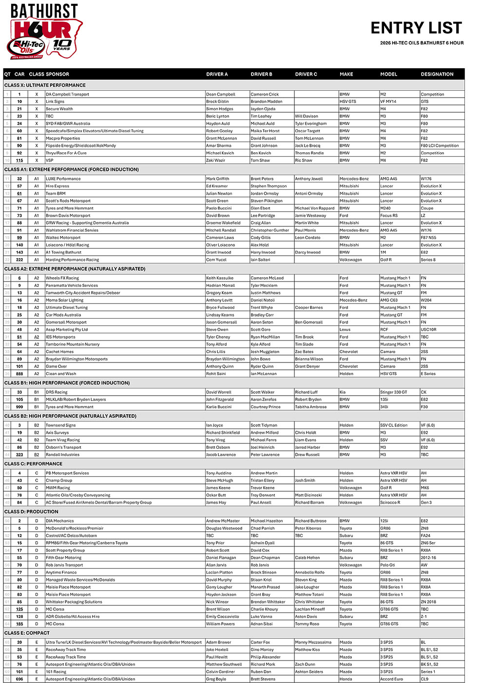 2026 Hi-Tec Oils Bathurst 6 Hour – Official Entry list
